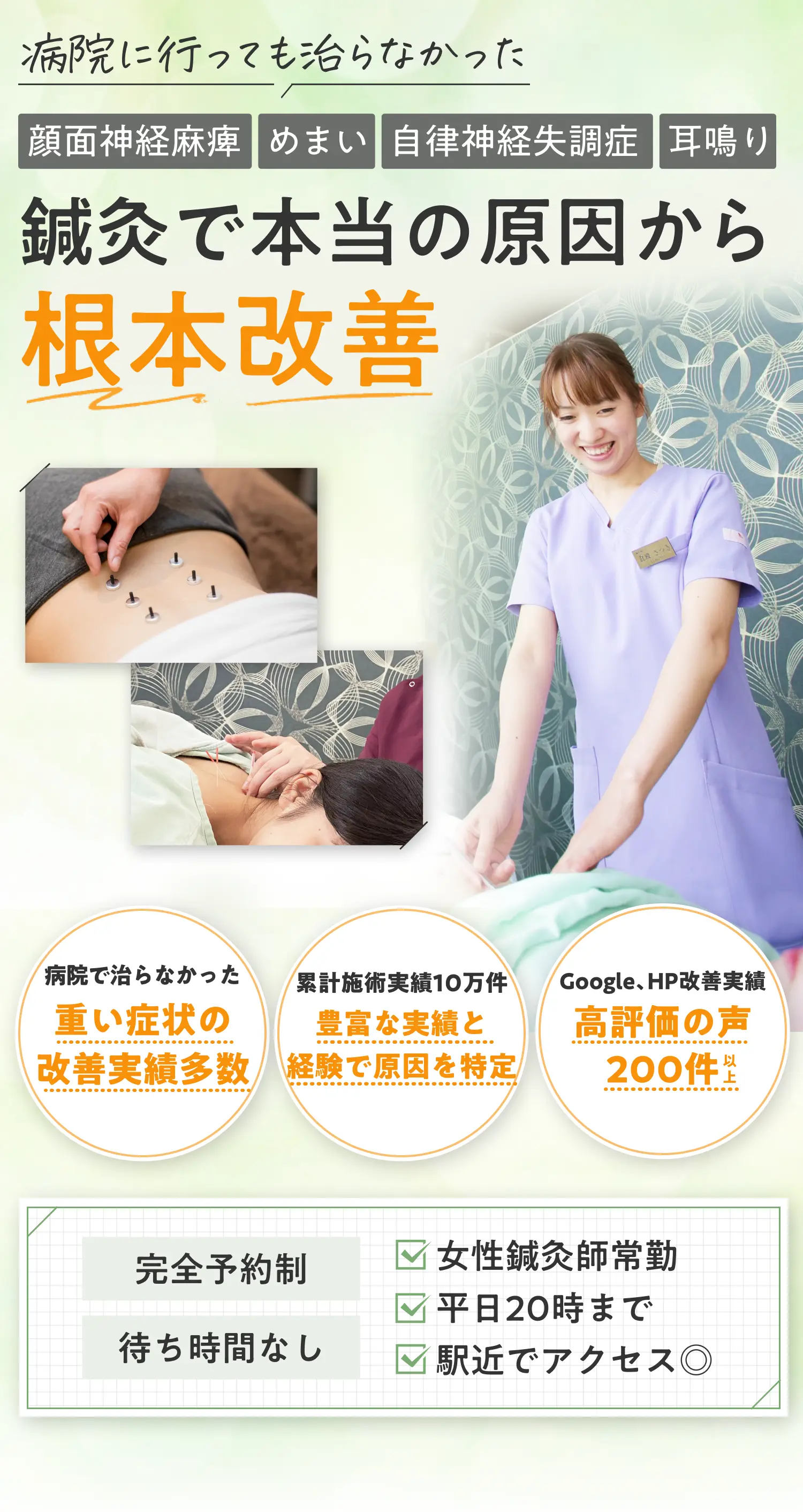 当院はあらゆる身体の不調を高い治療技術と豊富な施術経験を駆使して、”治らなかった”を改善します。身体の不調が改善されない理由は根本的な原因の改善がされないからです。当院は、10年以上培った経験と症例をもとに不調の本当の原因を見極め、高い技術を持った鍼灸師が原因の改善に対して的確な施術を行います。そのため、”治らなかった”が解決され、身体の痛みや不調を忘れた快適な日常を取り戻すことができます。