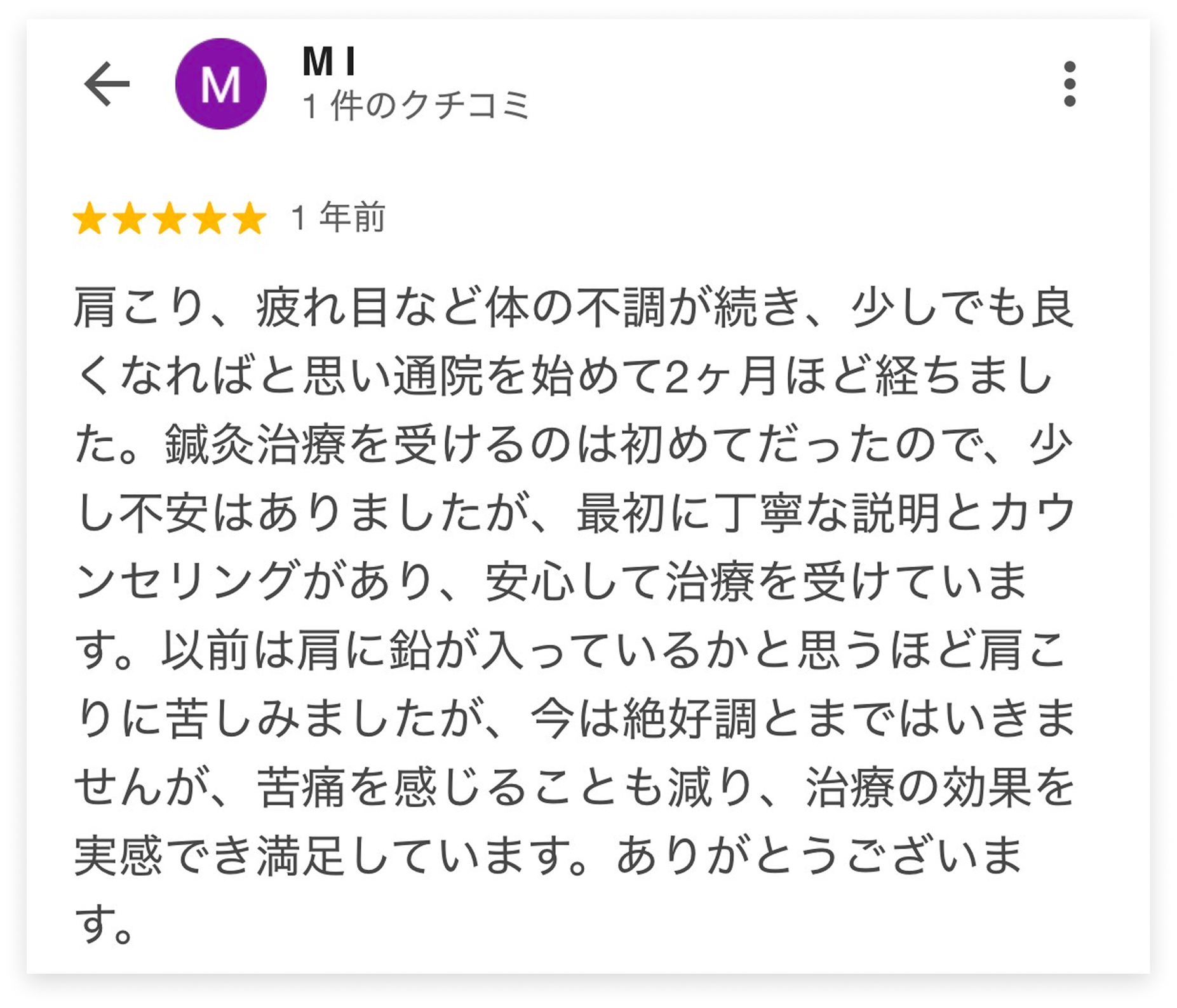私は2017年から家族の紹介で施術を受けるようになりました。当時は仕事の疲れで慢性的に疲労が全身に蓄積されていました。徐々に回復してきて仕事に集中できるようになりました。先生の鍼灸は心も身体もリラックスできるので、今でも定期的に体のメンテナンスをしています。